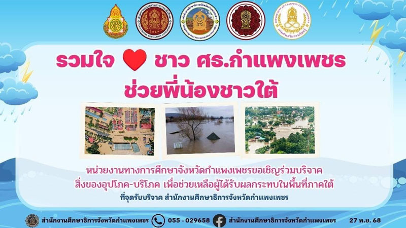 วันที่ 1 ธันวาคม พ.ศ. 2568 นายเดชา สมบูรณ์สิน ผู้รับใบอนุญาตโรงเรียนอนุบาลดรุณานุกูลลานกระบือ พร้อมด้วยตัวแทนคณะคุณครู เข้าร่วมบริจาคน้ำดื่ม จำนวน 50 แพค และสิ่งของอุปโภค-บริโภค เพื่อช่วยเหลือผู้ได้รับผลกระทบในพื้นที่ภาคใต้ ร่วมกับสำนักงานศึกษาธิการจังหวัดกำแพงเพชร ทางโรงเรียนขอเป็นกำลังใจให้กับผู้ที่ได้ผลกระทบในครั้งนี้